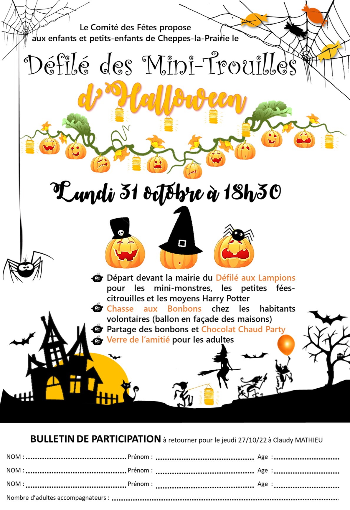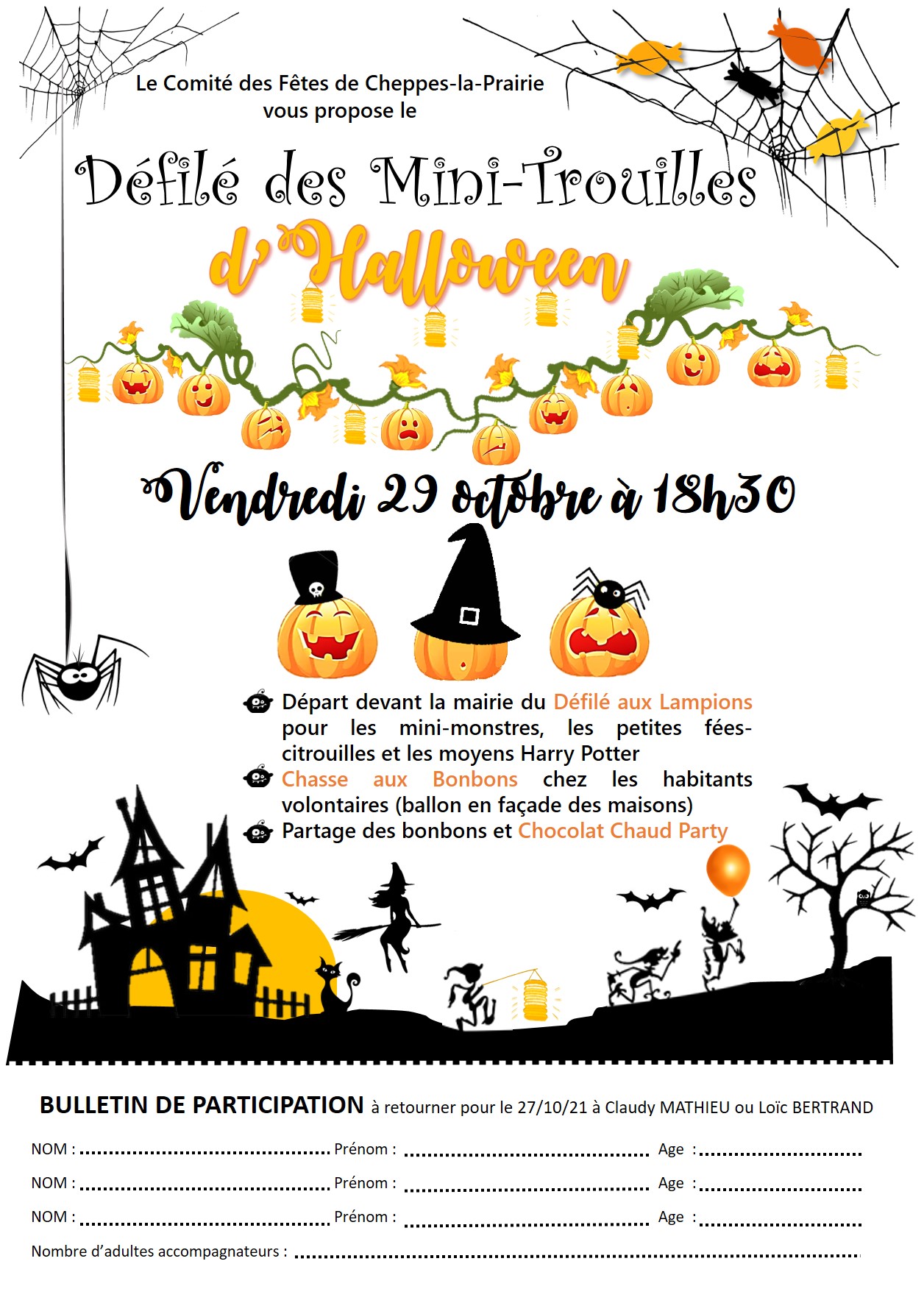 Le comité invitait les enfants et petits-enfants de Cheppes pour le défilé des "Mini-Trouilles" et la chasse aux bonbons d'Halloween lundi 31 octobre. Un grand merci aux habitants pour leur accueil et leur générosité. Certains ont joué le jeu en surprenant les enfants avec leur déguisement terrifiant !!!