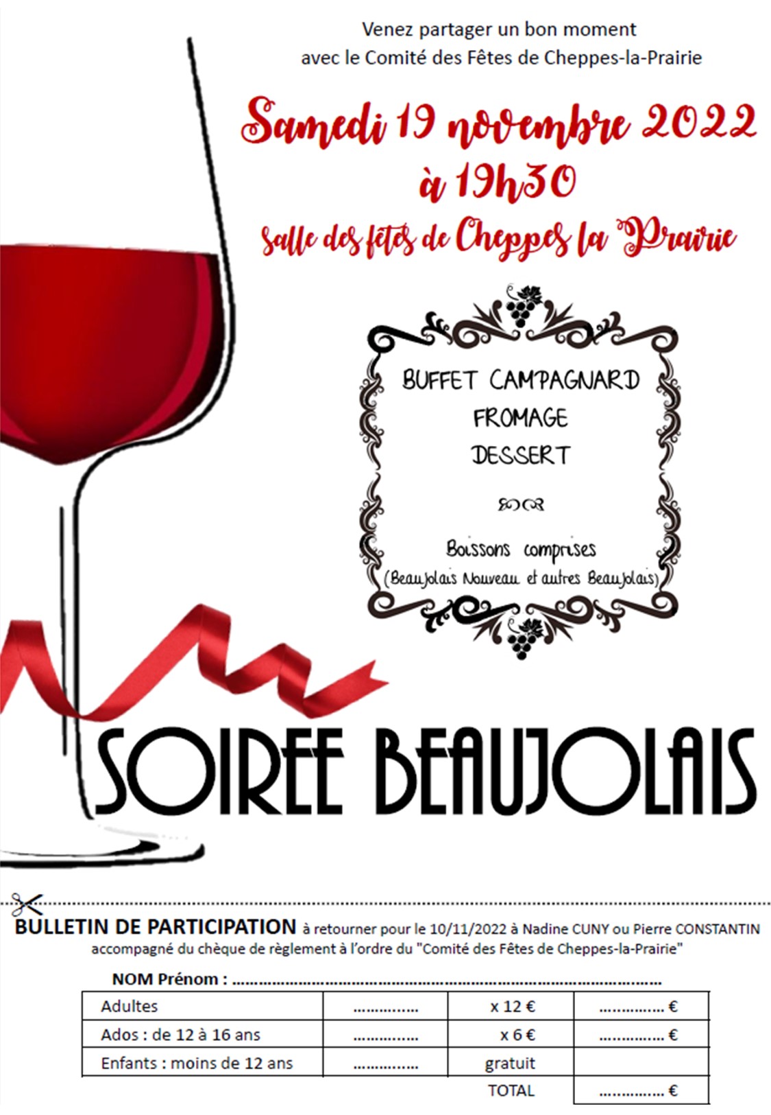Le Comité des Fêtes organise la soirée Beaujolais, autour du buffet campagnard et de différents crus du Beaujolais.