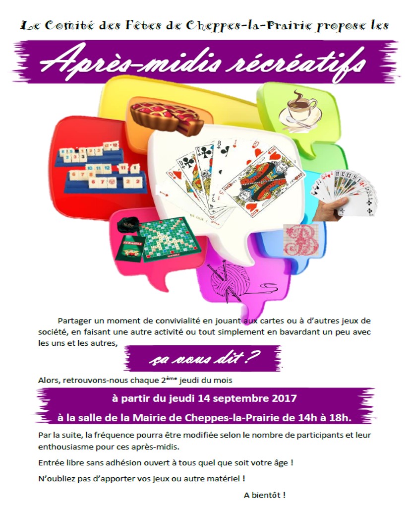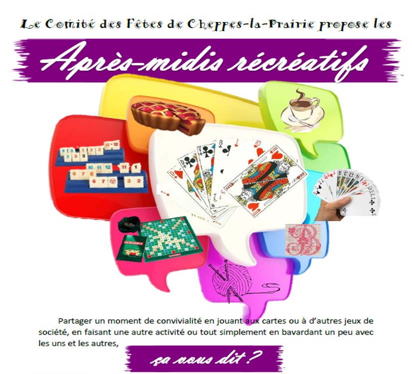 Nouveau ! Les après-midis récréatifs ont débuté le 14 septembre dernier : cartes, jeux, bavardage, tricot, partage,...