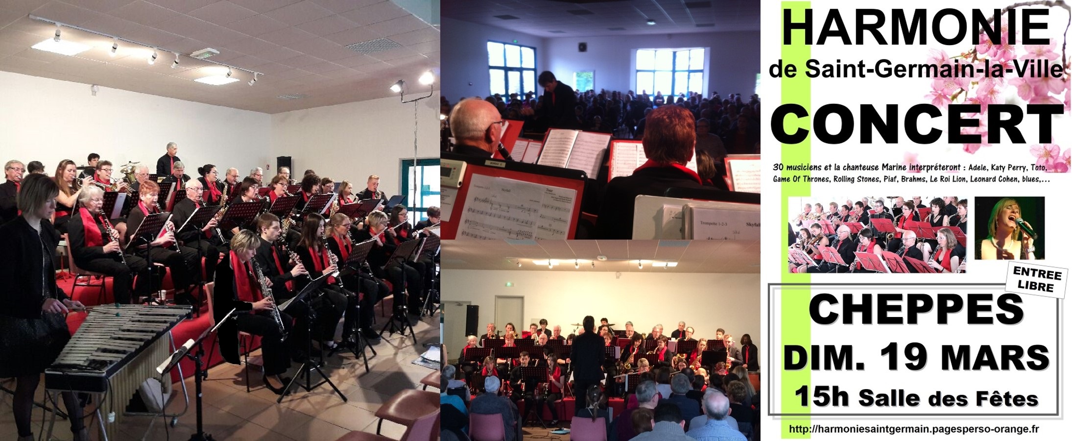L’harmonie “Les Enfants de la Marne” de Saint-Germain-la-Ville offrait son concert de printemps. Sous la direction de Sébastien PERARDEL, la trentaine de musiciens et la chanteuse Marine SIRHENRY ont interprété un programme très varié : Adele, Katy Perry, Toto, Game Of Thrones, Rolling Stones, Piaf, Le Roi Lion, Leonard Cohen, blues,… Près de 140 personnes ont assisté au concert de l'harmonie "des Enfants de la Marne" de Saint Germain la Ville. Les musiciens ont reçu une "standing ovation" pour leur prestation.
