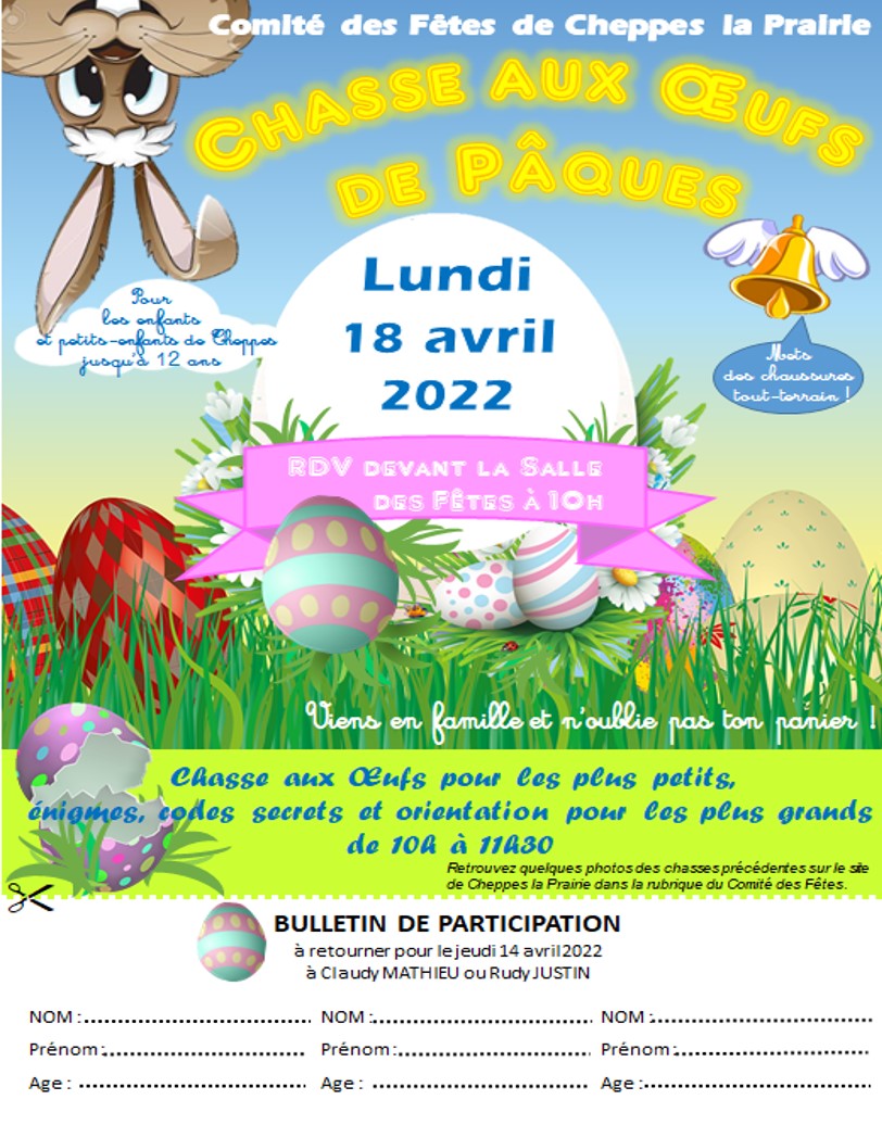 Le Comité des Fêtes conviait les enfants et petits-enfants de Cheppes à la chasse aux oeufs dans les rues du village : chasse pour les plus petits, énigmes, codes secrets et orientation pour les plus grands.