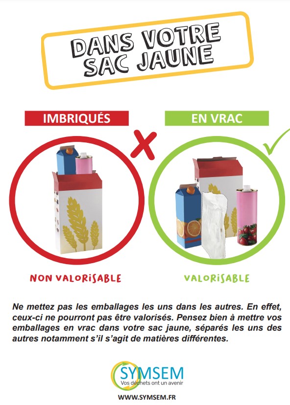 . Je dépose mes emballages séparés les uns des autres dans le sac jaune.